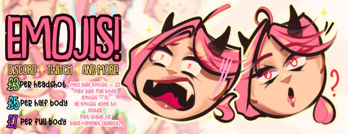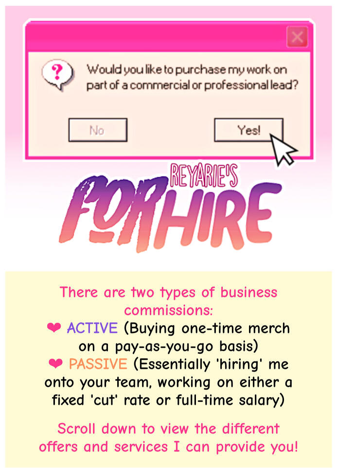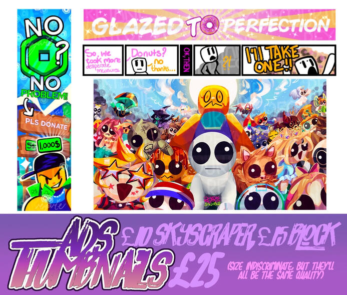 ❤︎Why are there no PASSIVE options?❤︎As you may already know, I am quite a busy person, constantly under workload as well as obligations from school, life, etc. Saying that, I am currently unable to work part/full time as any creative position at a group, studio or company. Best believe that I will continue to update this if need be with any updates or confirmations based on the matter. Until then, if you require my services regularly, you can purchase them as an active commission.This section will constantly expand as I develop further capabilities to satisfaction.For anything else, even if it's business related, it's applicable under the normal prices.If you're buying icons/small thumbnails like gamepass buttons (in bulk), they're:- £4 each