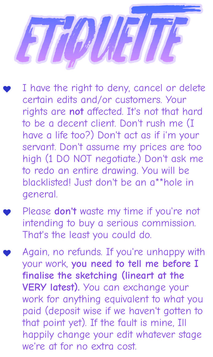 For total orders under £50, you must pay upfront. This is non negotiable for first time buyers. Once I have proof that it's done successfully, I can count your order as validated. Otherwise, for orders over £50, you pay 50% upfront, and 50% after the sketching phase. If you're paying in gift card/Robux it's best just to pay it all upfront. Sometimes I may allow seasoned commissioners to pay later, but this is defo not a guarantee!